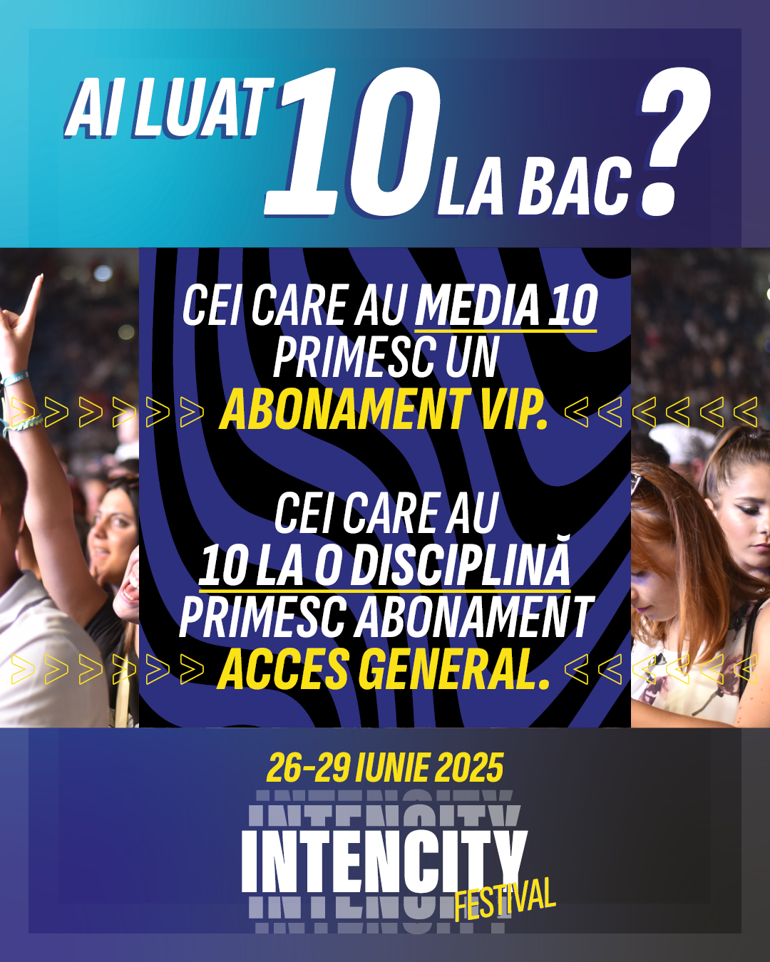 Festivalul IntenCity celebrează nu doar muzica și distracția, ci și performanța și efortul. În semn de apreciere pentru tinerii din județul Dolj care s-au remarcat prin rezultate excepționale la examenul de Bacalaureat, organizatorii oferă abonamente la festival pentru toți cei care au obținut anul acesta nota 10 la una sau mai multe probe de examen.